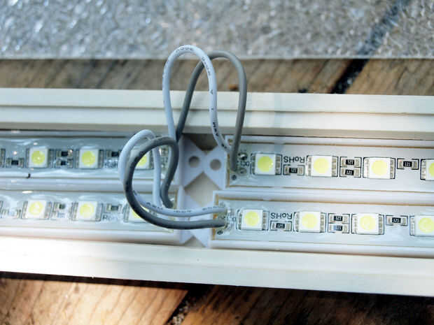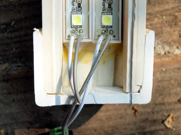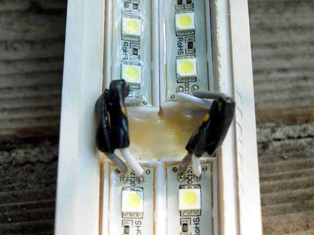 Siguiente paso fue plegar y pegar abajo de los cables. Usé pegamento caliente del derretimiento para esto. También sirve para hacer todo lo impermeable. A lo largo de este proceso que seguí probando las luces para asegurarse de que no desconectar ninguno de ellos. Fue agradable que mantienen encendido tras el abuso de de que ponerlos a través.