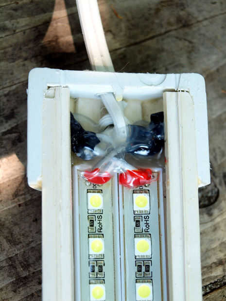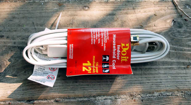 Planeé sobre el uso de cable de la lámpara regular de energía pero cuando precio en la tienda de hardware fue 49 centavos de dólar por pie. Un cable de 10 pies me costaría 5 dólares. Pero tonto como costuras los cables baratos había realmente cuestan menos. Compré un cable de extensión de 12 pies por menos de 3 dólares. Cortar los extremos y tenía mi cable de alimentación. Perfore un agujero en el extremo. Soldar y aislar y se hizo. Con el nudo y el pegamento no es probable que saque. Una vez que todo está seco y las emanaciones ido trabajaré alguna silicona en el agujero para sellarlo.