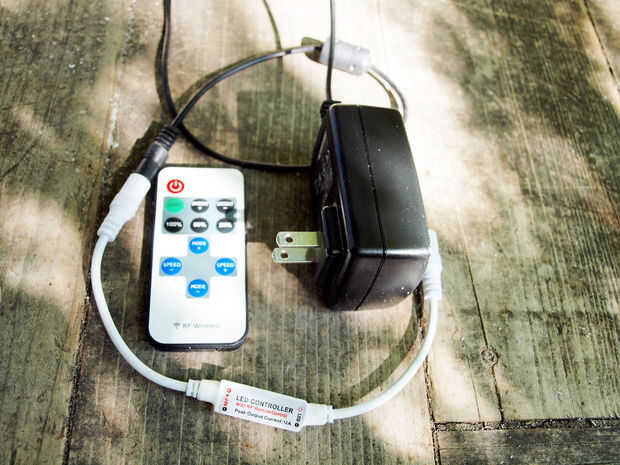 Yo no he puesto un encendido apagado encender la pipa. En cambio tengo un mando especial en el extremo de la cuerda. Es una unidad de RF y además de giro las luces de encendido y apagado pueden atenuar también les. Hay un preset 50% y 25% y 100% completo brillante más dos hacia arriba y hacia abajo los botones variará desde brillante a casi no. Y el controlador también tiene un montón de modos que parpadeará las luces junto con un botón para acelerar y frenar. Unidad poco bastante resbaladiza. También es posible omitir la unidad de control y apenas lo enchufe en la fuente de 12 voltios. Pero luego sólo tienes completo brillante y son casi de brillantes sin un atenuador. También tengo un pequeño en línea dimmer mecánico puedo usar en lugar de la fantasía.