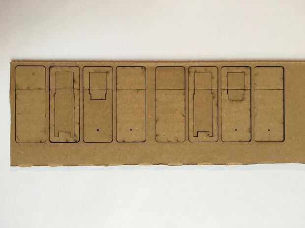Utiliza un lasercutter para hacer este prototipo, esto garantiza un corte preciso y bordes lisos. (Se puede cortar con un cuchillo pero el resultado sería el mismo...) Dispones de un pequeño agujero para el indicador LED en el dispositivo.