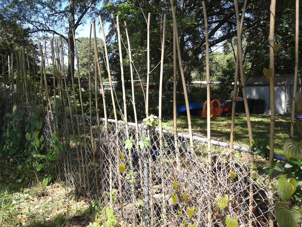 Esta parte es bastante fácil, sólo Deslice sus polos entre la guía y la baranda superior y luego apuñalar a la parte inferior de la caña de bambú en el suelo tan duro como usted puede. Espacio les uniformemente cada pocas pulgadas a lo largo de la valla. No te molestes en cortarlos, sin embargo, que estará próximo a. Si eres como yo y no podía esperar hasta que fueron completamente curado al sol antes de comenzar su valla, esperar al menos hasta que haya curado antes de cortar a la altura, o usted tendrá un tiempo difícil cortarlos y te aplaste más esquileo. Tratar en empujar para que quedar al ras con la guía existente y son más o menos hacia verticalmente. No sudarlo que algunos de ellos no muy rectos, el tejido puede ayudar a enderezar a algo.