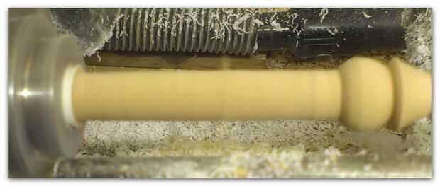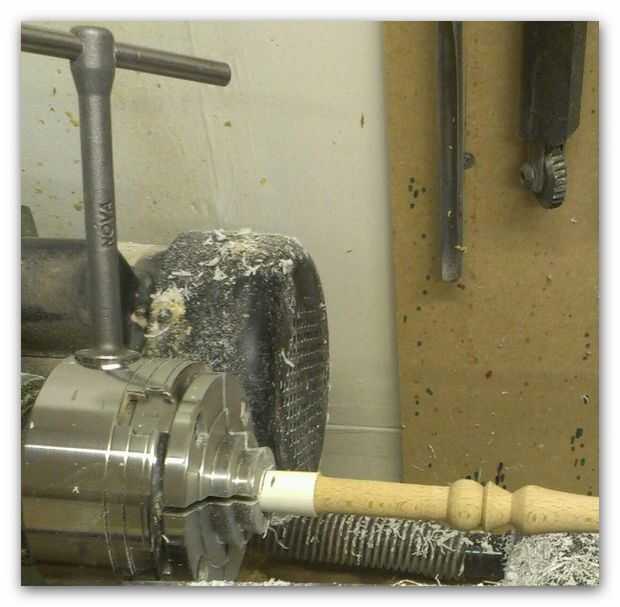 No sé cuánto tiempo la tennon tendría que ser en el tallo - así que utilicé las marcas hechas en el tallo antes de sacar del torno en el paso 1 para ayudar a centrar en el torno - luego amplié el tennon había hecho previamente y luego lo separó de la acción de las mordazas del torno.