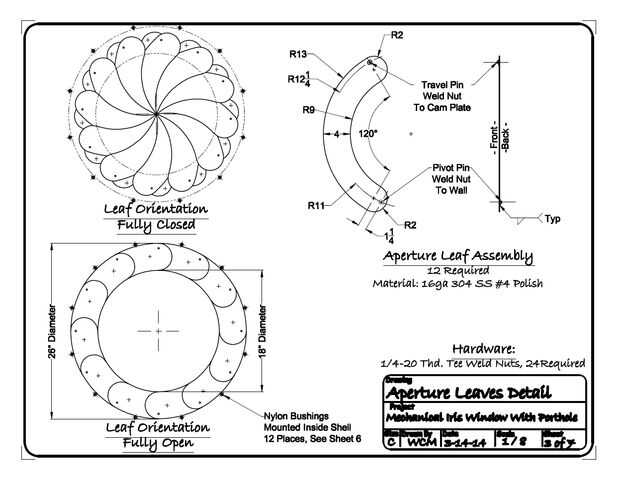 Las hojas se intercalan entre la placa de levas y la pared y cada hoja tiene un pasador en el lado de la cam y la parte posterior. Miden 4" de ancho, con un interior radio de 9" y un radio exterior de 13". El acero inoxidable 18 grado 304 calibre con un pulimento de #4 y cortar sobre una mesa de plasma CNC.