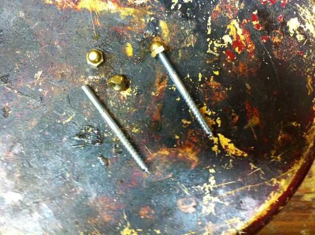 A partir de la tapa los agujeros de montaje, he instalado un par de los pernos de 1/4-20 x 2-1/2" detrás de la pared. Estos son un poco largos, 2-1/4" habría funcionado mejor pero no estaban disponibles cuando se les necesitaba. Así que ha acuñado les para arriba un poco con bujes de nylon más cortadas hasta 1/4" de largo. Esto deja aproximadamente 1-3/4" de perno que se pega a través de la pared, sólo lo suficiente para el grueso de la cáscara y una tuerca de cobre amarillo brillante en la parte superior.