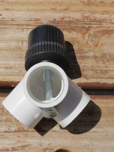 6. Perfore un orificio de 3/8" directamente a través de la parte superior de la salida lateral de PVC, a través de todo el camino hasta el fondo. Deslice el perno de 3/8-24 a través de la parte inferior y el tornillo en el portabrocas (ver figura 1)