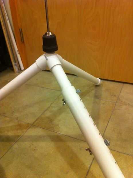 4. Deslice el 14" 1" sección de PVC en la 14" 1.25" sección, con una pulgada o tan sobresale. Perforaciones 10 1/4" recto a través de ambas piezas a intervalos de una pulgada. Una prensa del taladro es ideal aquí porque la idea es que usted quiere los agujeros a la línea para arriba no importa cuánto usted Deslice/salida 1" sección, dándole una pierna de longitud ajustable que puede ser asegurada en su lugar con los tornillos y tuercas de mariposa. Pero incluso con mis habilidades de perforación malas pudo conseguirlo al trabajo después de ensanchar los agujeros un poco. (Ver figura 3 a continuación para ver cómo esto se ve en el cojín montado).