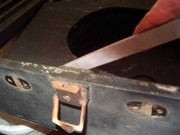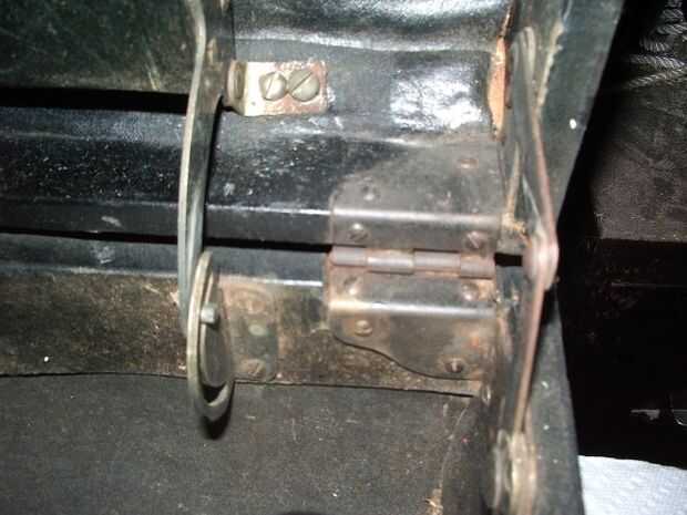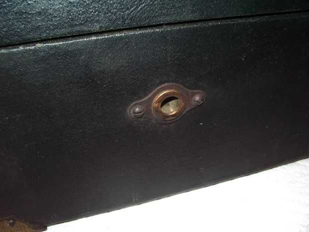 El pestillo en la parte delantera de la caja y los montes de mango fueron clavado en con remaches de la cúpula, por lo que presentó la parte posterior de los remaches off (foto 6) y condujo los remaches hacia fuera con un sacador.