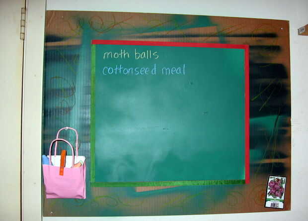 Para mi pizarra de garaje, usé pintura de pizarra y había pintado directamente sobre la pared en el garaje, entonces utiliza un cartón para hacer un marco y tachuelas para arriba. El cartón era algo que utilizaba como una "lona" cuando otro proyecto de pintura a pistola. Pensé que tenía un patrón interesante, por lo que lo solía para hacer en el marco de mi pizarra. Puse algunos tiza en un bolso y thumbtacked a la cartulina por lo que podría escribir la lista de cosas que necesito (cuando me acuerdo que lo necesito). O si estoy midiendo algo, puedo escribir en esta pizarra para no tener que pescar un trozo de papel.