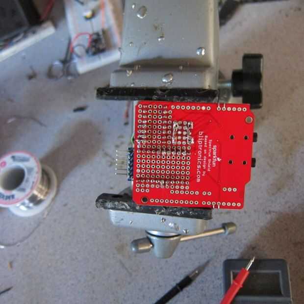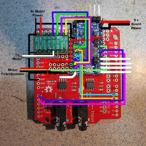 Así que tenemos nuestros tres componentes para nuestro controlador de mandíbula. El escudo de espectro es lo suficientemente grande para acomodar el mini pro MC y el regulador del motor como se muestra en las fotos. Tiempo de romper el soldador y montar estos. Usted puede encontrar un diseño alternativo, pero se trata de cómo mía. Pind encabezado se extienden a través de la Junta donde se conseguir cableados según el diagrama de cableado. Cable de calibre más pesado puede utilizarse en los cables de potencia del motor (el mismo calibre es en los cables de alimentación de 9v en el Elvis Alive). Los otros cables pueden ser calibre más pequeño. Para la conexión de pines en la placa montada, opté por usar alambre sólido. Energía (arduino, sensor de posición del motor y potencia del motor) utilizar alambre encalladura porque el flex más sin romperse. Se proporciona un esquema detallado.