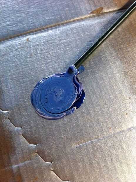 Aquí, se mezcla el esmalte de uñas blanco, morado y azul en el cartón (o cualquier otra cosa decidió utilizar para la mezcla). Sólo vierta un poco de los colores y con un palillo de dientes o el final de su pincel no se mezclan con las cerdas.
