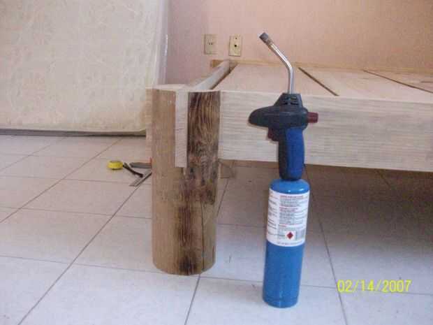 Tomar la antorcha de la plomería (soplete de propano) y quemar un poco la superficie de la madera (entre 3 a 5 segundos será suficiente) constantemente moviendo el soplete para evitar el final total de carbón de leña. Pruébelo y usted conseguirá la caída de ella muy rápido.