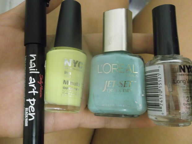 Necesita un esmalte azul cielo, amarillo polaco, Polaco claro y un quitaesmalte de uñas de Sally Hansen.