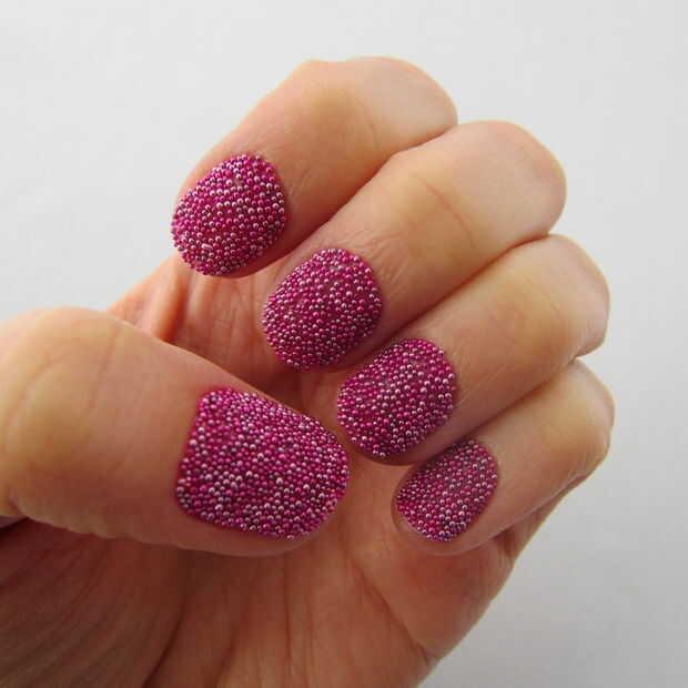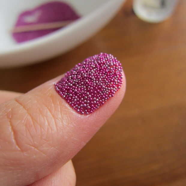 Comience por pintar dos o tres uñas con capa transparente o endurecedor de uñas. Manteniendo los dedos en un recipiente poco profundo asperja microbeads en Polaco mientras está todavía húmedo o pegajoso. Voila! Las perlas del palillo.
