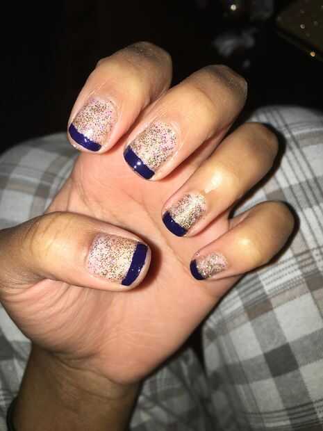 Uñas de punta francesa azul oscuro brillo oro (10 / 10 paso)