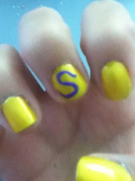 Una vez que el amarillo es seco el esmalte púrpura y un striper y pintar una "S" en su dedo medio derecho.