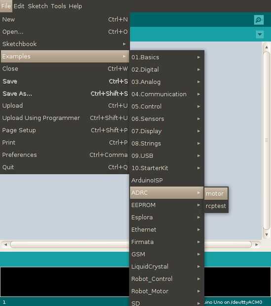 La biblioteca viene con algunos ejemplos. Utilizar el IDE para abrir el ejemplo de 'ledonoff' que es parte de la biblioteca ADRC.