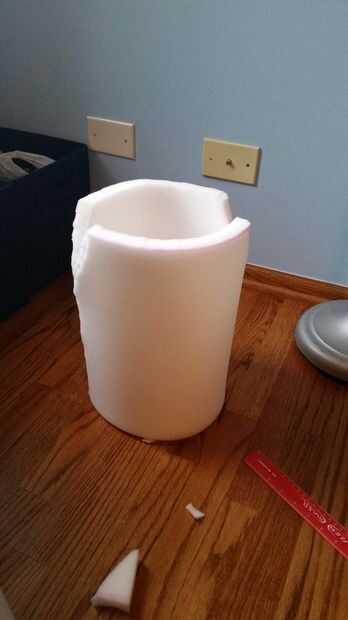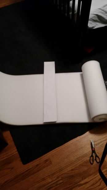 En primer lugar, tienes que medir la distancia alrededor de su cabeza y corte la espuma en esa marca. Una vez que tenga la longitud correcta, las primera de 5 pulgadas en la parte inferior para hacer la forma de un tubo del pegamento. Después de que se seca, hace un recto línea otro cinco pulgadas más arriba de donde pegan. Corte a lo largo de esta línea. Cortar una forma de "v" en el otro lado del tubo y pegar los lados juntos para formar un círculo más pequeño en la parte superior del tubo. Una vez hecho esto, corte el tubo a la cabeza.