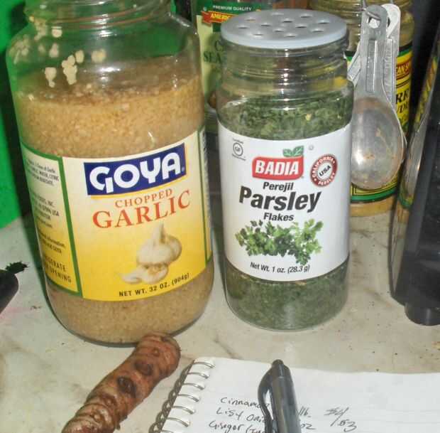 De la carta fui con aproximadamente los valores máximos de los elementos fundamentales de esa lista. No fue hasta que estaba bien en lo que consideré que va con las mezclas de especias de Curry y cajún. En el de la Santísima Trinidad, Cajun criollo a veces Utilice ajo, perejil y chalotas (un tipo de cebolla) como variantes. Entonces fui con ajo y perejil con el ajo más para el sabor y el perejil más de color.