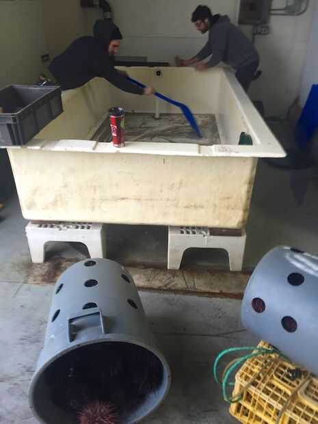 Este tanque específico en Pier 45 San Francisco bombas agua Bahía de 5-20 pies por debajo, dependiendo de la marea. El erizo se almacenan en contenedores perforados para mantenerlos separados de los cangrejos de dungeness vivo que comparten el mismo tanque.