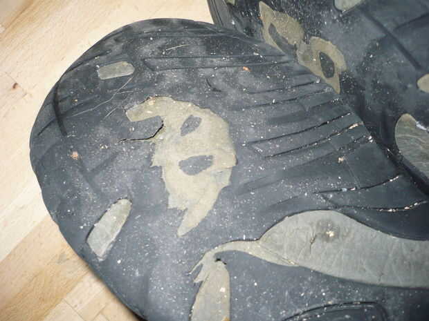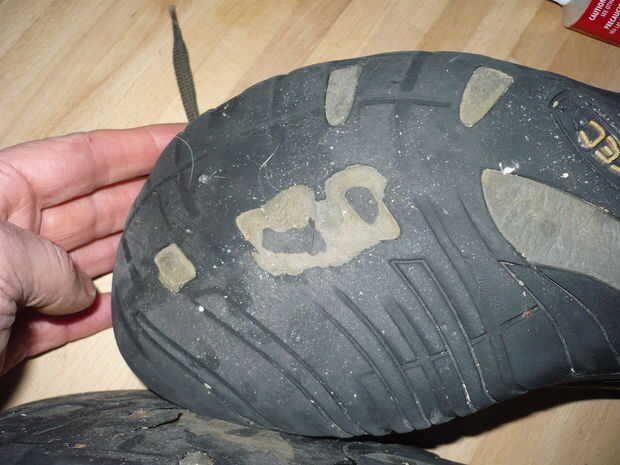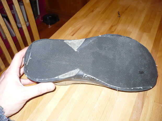 Actualización: Uno los elementos de la cinta caminadora que me atrajo - dureza - es también un problema. Porque no se estira, cuando la zapatilla flexiona el pegamento en el dedo del pie es tirar el pegamento en el talón. Caminar está bien, pero no creo que llevará a cabo. Mi sugerencia es poner un parche en la parte delantera media y un segundo en el talón. O utilizar un neumático o la otra losa de goma. Sigo experimentando.