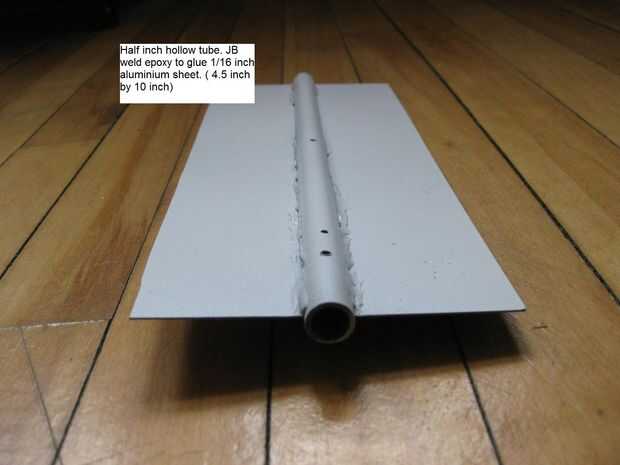 Tomar una amoladora o hack vio corta el tubo de 1/2 pulgadas por la mitad, la parte superior de 5 pulgadas, ahora Deslice la hoja de aluminio en el corte y pega en su lugar.