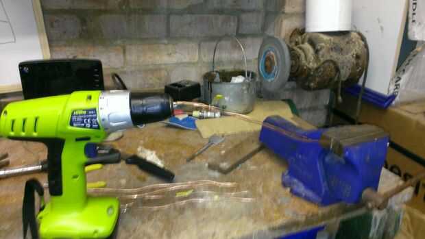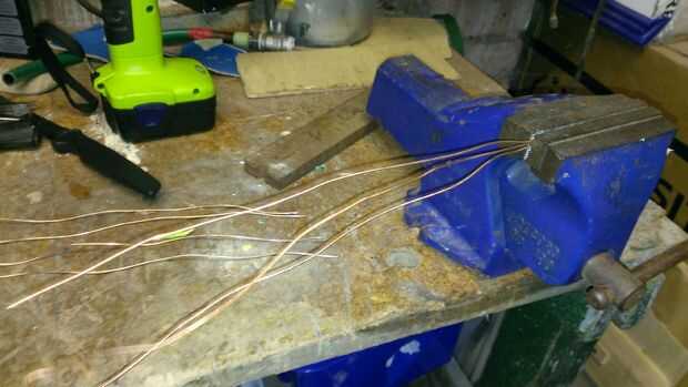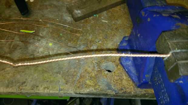 Han rayado el alambre, separe las seis hebras de alambre y tomar tres de ellas hacia fuera y luego ponerlos nuevamente en el vicio. Tome el extremo libre y colocarlo en el extremo del taladro como una broca. Encienda el taladro y espere hasta que la longitud del alambre en completamente enrollada, retire el hilo de ambos dispositivos.