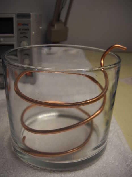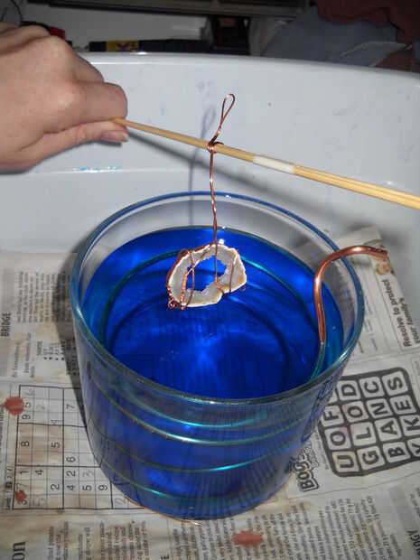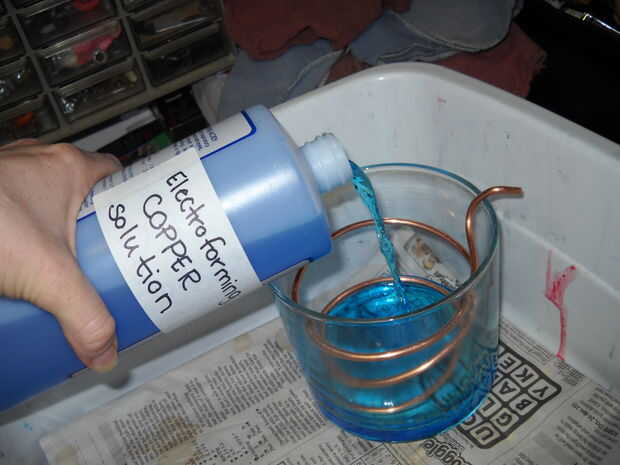 -Con el ánodo en el lugar en el recipiente de vidrio, vierta cuidadosamente la solución galvánico de cobre en el recipiente.