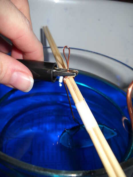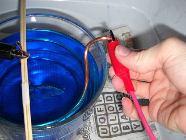 -Conecte el cable rojo positivo al ánodo de cobre que se extiende fuera del contenedor de vidrio.