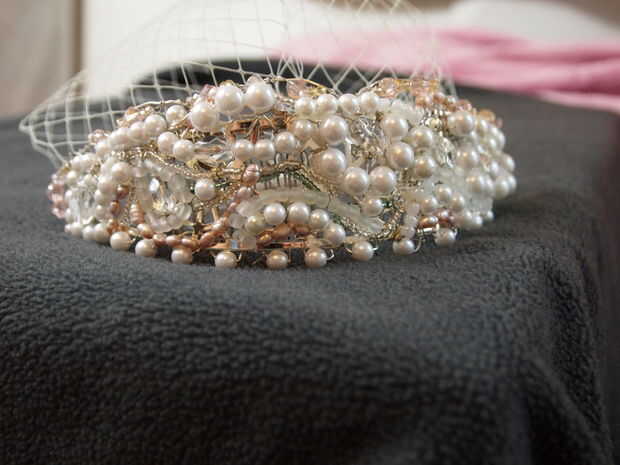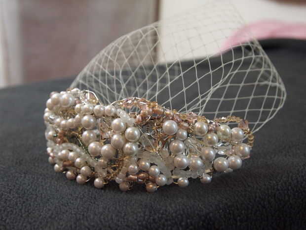 Este tocado de inspiración vintage y jaula desmontable velo es maravillosamente único y no difícil de hacer! Solo toma un poco de creatividad y paciencia! Necesitaba algo que hacer, he quedado encerrado en casa para los últimos días con mi hijo, que ha estado realmente enfermo. Tengo un montón de abalorios y alambre para hacer clips de cabello. Incluso tenía el material del velo que compré para un proyecto de arte de la Universidad. También tuve una pulsera brazalete de plata grande que compré en venta por $1 de Michaels - y este artículo que transformado por doblar y formar para crear la base para el casco entero.