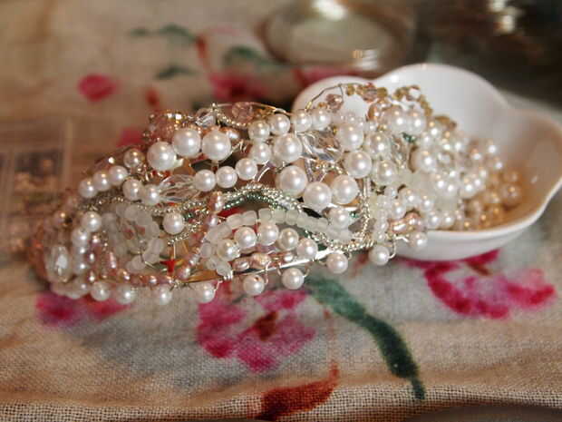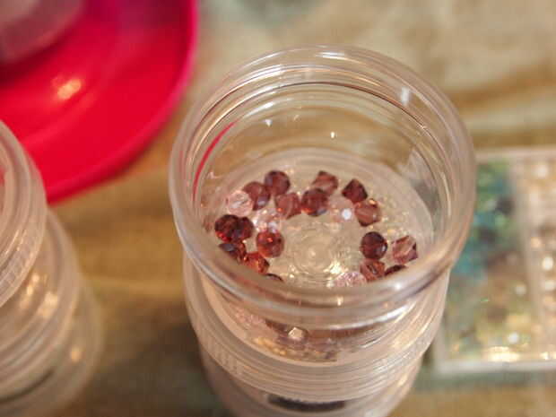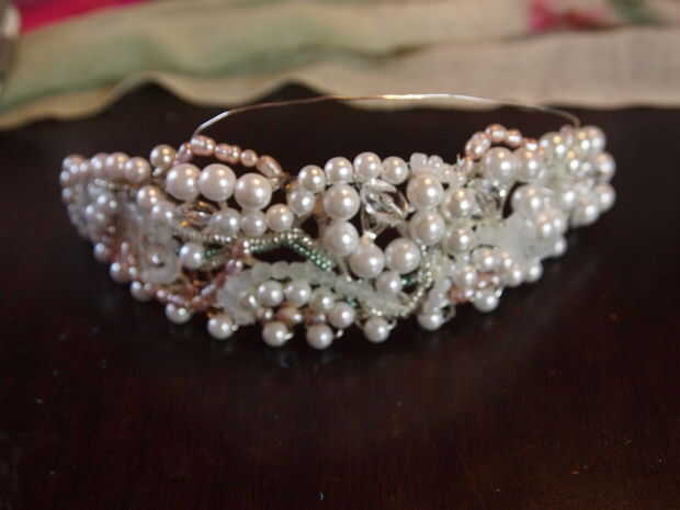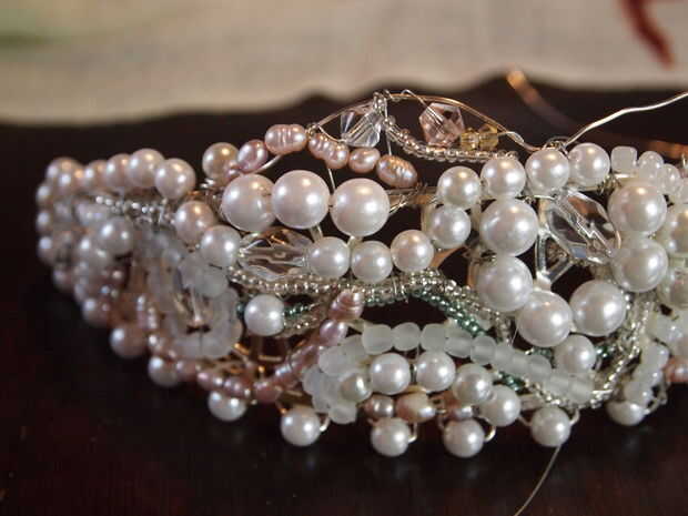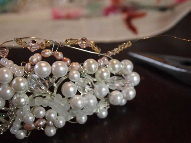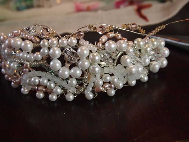 Luego sacó otra vez el alambre más delgado y aseguró el principio de una curva y cuentas con varios pequeños cristales y un cristal de color rosa más grande. Traté de hacer eso para todas las áreas curvadas - aunque difieren con el número de granos dependiendo de la cantidad de espacio disponible. La mayoría de los cristales en que cuentas colgaban por debajo de la pieza principal de la curva, pero una pareja se colocaron por encima de ella - ver fotos. Si pudiera hacerlo otra vez, sin duda haría las curvas del alambre grueso más grande y más prominente - sería aún más impresionante. Es difícil ver exactamente cómo esto se ve en las fotos - pero hace un efecto precioso y creo que es la parte más bonita del casco.