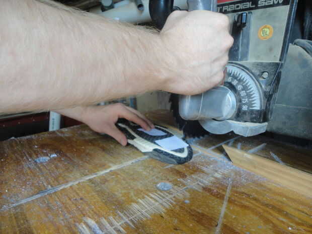 Hay dos opciones cuando se trata de cortar en las suelas de zapatillas - se puede utilizar una sierra de mano o un brazo radial vieron. El pro de utilizar una sierra para metales es que usted consigue un entrenamiento fenomenal, la estafa es que tomará algún tiempo para terminar todos los cortes. El pro de usando una sierra radial del brazo es que se tarda minutos para terminar todos los cortes. Teniendo en cuenta que ya trabajé hoy, fue con la sierra radial del brazo. Por favor ser cautos y respetar todos los procedimientos de seguridad al utilizar cualquier tipo de sierra.