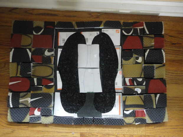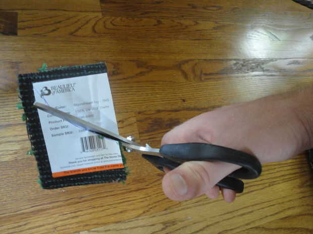 Quitar el césped artificial con el papel pegado a él y corte a lo largo de las líneas que usted sólo trazado. Esto asegurará que el césped artificial se adapta perfectamente alrededor de la suela de zapatilla de deporte de centro! Una capa de muestra de césped artificial no será lo suficientemente alta para permitir a una persona utilizar la potencia de cepillado cuando limpie los pies. Así que usted necesitará otra capa de césped artificial en el mismo diseño que el que sólo se corta. Me pareció la manera más fácil de hacer esto poner una capa de césped artificial sobre la capa simplemente cortar y utilizar la capa que ya se corta como el patrón de cómo cortar la segunda capa de césped artificial.