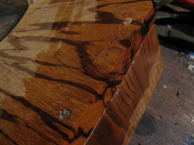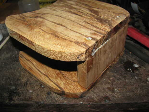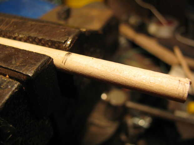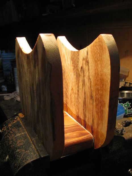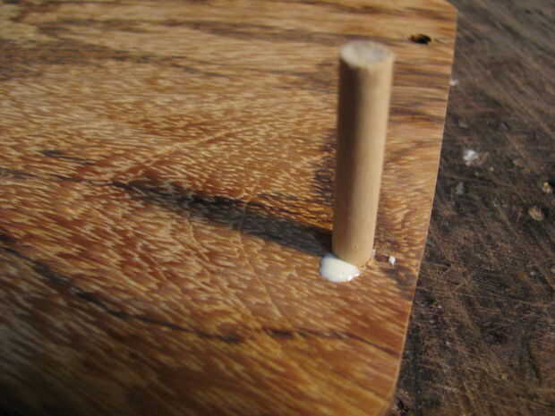 Una vez que ambos lados están perforados en la base, cuatro pedazos de varillas se cortan a una longitud apropiada - sobre una pulgada y cuarto. Pegamento de madera entonces se agrega a los puntos donde la madera se une y las piezas se mantienen unidas por las varillas. Lo pongo en una mordaza de banco para sostener firmemente juntos. Deje que se seque para una cantidad adecuada de tiempo.