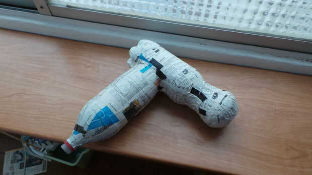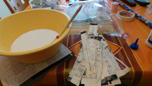 disuelve un poco de cola blanca con agua y moja tiras de papel luego dale un par de capas por toda la superficie de las botellas deja Blizzard una noche