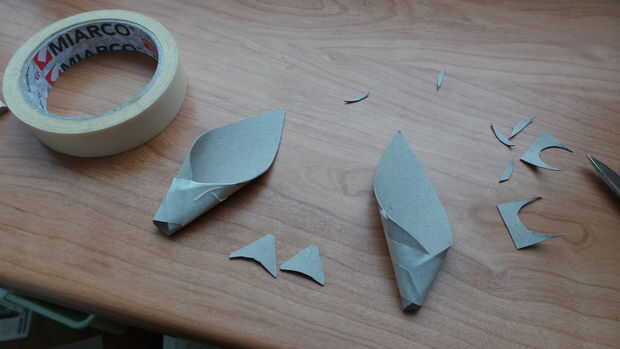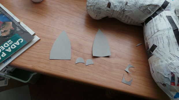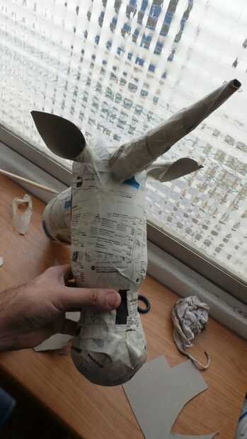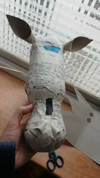 recorta en cartón o cartulina las orejas y las fosas nasales pegalas con cinta de carrocero o celo despues refuerza las uniones con mas papel mojado en cola para queden resistentes