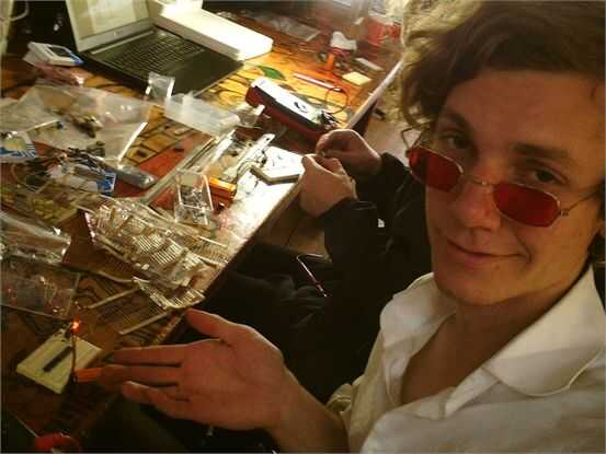 Una batería de 9 voltios conduce un LM317 salidas 5 voltios fuente de alimentación, conducir una astilla pequeña de la roca cristalizada en resonancia en uno y medio mil vibraciones por segundo, dividido por la mitad, 8 veces, por un contador binario, hasta una velocidad de unos seis vibraciones por el segundo, un LED de conducción.