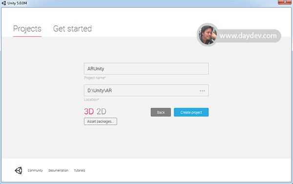 Cuando ejecutas el programa de la unidad, inserte el nombre del juego para el nombre del proyecto, ubicación para almacenar el proyecto algunos donde en su ordenador y seleccione la opción 3D.