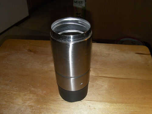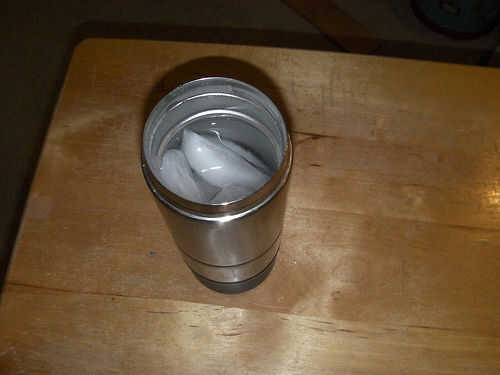 El termo es lo que alberga todo el hielo, agua y sistema de bomba de agua para que el líquido está siempre en movimiento. Yo también dremelled tres pequeños agujeros en la tapa superior, que es cómo los dos duro tubos de plástico que están conectados a las bobinas de enfriamiento, así como el cable de la batería, ajuste a través de la tapa para el agua de hielo.