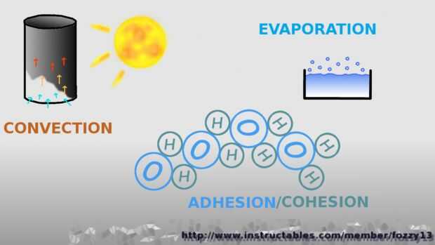 Estos tres principios hacen que la unidad lo que es. El sol brillará en la unidad y calienta el aire en la parte inferior del eje. El aire aumentará y también dibujar en más aire de la parte inferior. El aire se eleva, hará agua en una pequeña cámara que se evapore. Cuando el agua se evapora, tendrá energía de aire caliente para cambiar de líquido a gas. Esto hará que el aire circundante más frío. El agua es traída en contacto con el aire móvil por un trozo de tela. La tela se tire el agua de la cámara para aumentar la superficie del agua con respecto al aire móvil. Como el agua se evapora y la tela se seca, más agua se sorteará el tejido debido a la genialidad de cohesión y adhesión.