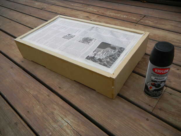 4. todo debe ensamblarse. La pieza de tela se puso en posición, desde la pipa hasta el borde de la caja de metal. Los agujeros fueron perforados, y tornillos de madera pequeños fueron utilizados para sostener la caja metálica en la placa base. La parte inferior de la caja del metal, así como la caja exterior de madera fueron caja pintada de negra.