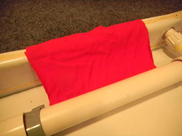 1. un pequeño pedazo de tela debe cortar y encajar en el corte hecho en el tubo de PVC de 1". Mina era de una camiseta vieja.