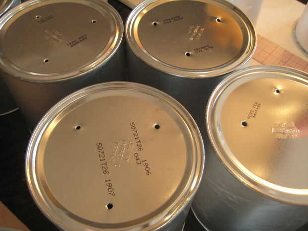 Retire los contenedores de las latas y lavarlas. Si utiliza el tipo de cartón, no dejes que alojarte de húmedas por mucho tiempo. A su vez las latas de abajo hacia arriba y usan el clavo y martillo para hacer 3 agujeros de guía en cada uno. Había estimado la ubicación, pero si eres super anal, hacer una plantilla con los tres agujeros equidistantes unos de otros y alrededor de una pulgada del borde de la lata.