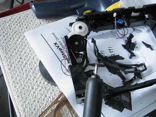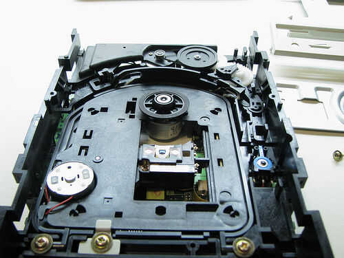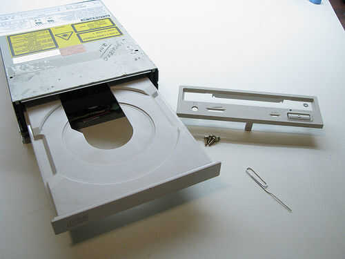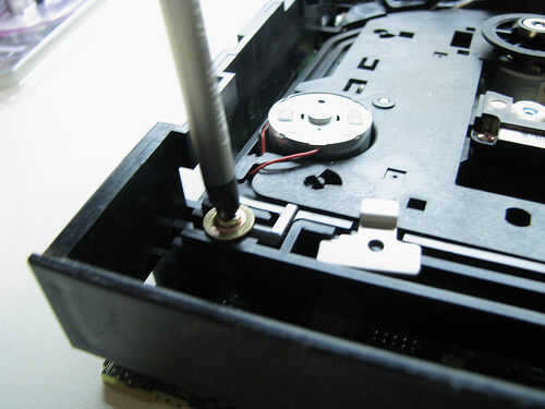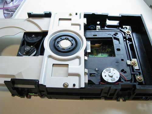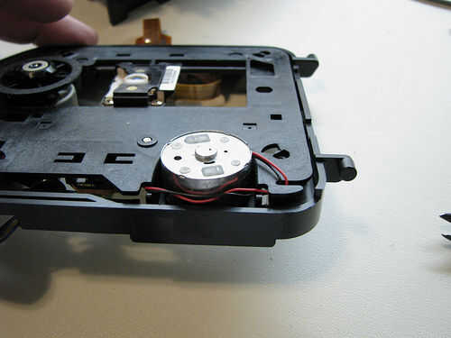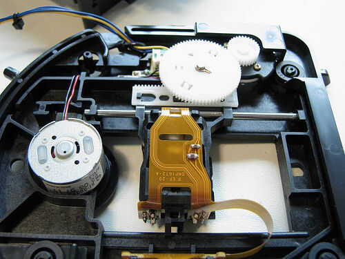Para abrir tu unidad de CD-ROM pop Abra el frente usando un clip de papel y un destornillador pequeño. Este CD-ROM tiene 3 motores, uno para hacer girar el CD, uno para abrir y cerrar la puerta del coche y a mover la lectura escribir cabeza hacia adelante y hacia atrás. Deconstruir la unidad buscando tornillos y broches de plástico. Busca un motor que funcione bien. El tren de la impulsión que se utiliza para abrir la bandeja de la unidad es realmente agradable en este modo. Tiene una sección angosta de plástico con todos los engranajes en una fila. Se utilizó una herramienta Dremel con un disco de corte para cortar el motor y los engranajes de la unidad de CD-ROM.