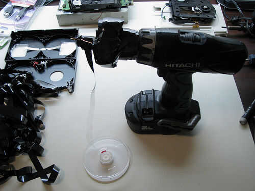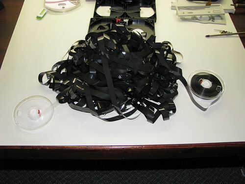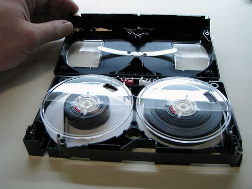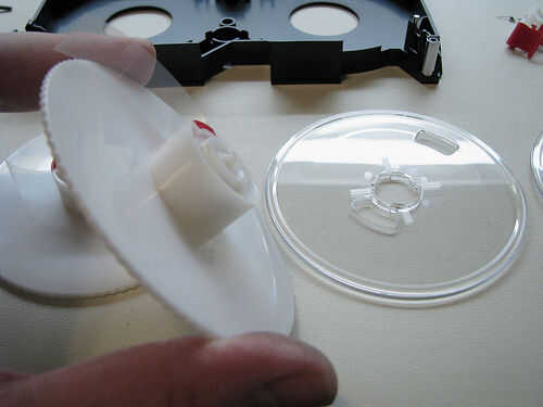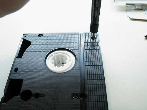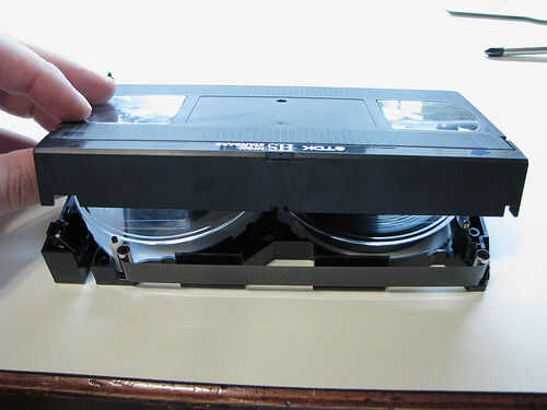 Desmontar la cinta VHS, por lo general hay 4 o 5 tornillos en la parte inferior de la cinta. La parte superior sólo debe Levante después de eso. Usted entonces buscará en dos carretes con lo que parece millas de cinta adhesiva sobre ellos. Desentrañando una pequeña mano y lo llevó para siempre. El carrete más grande fue revelado con la ayuda de un taladro. :) Yo podría podido simplemente deslizar la cinta si me di cuenta de que la porción clara del carrete solo era bloqueada en su lugar con un simple giro. :(