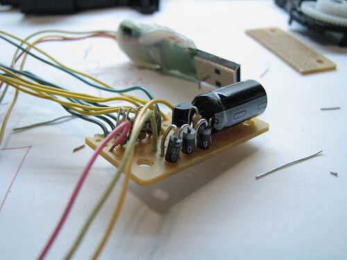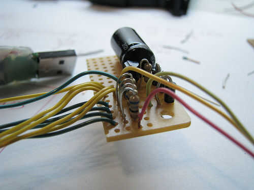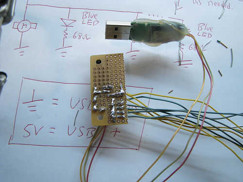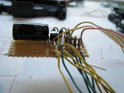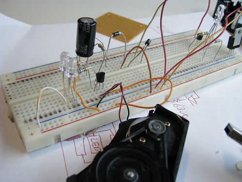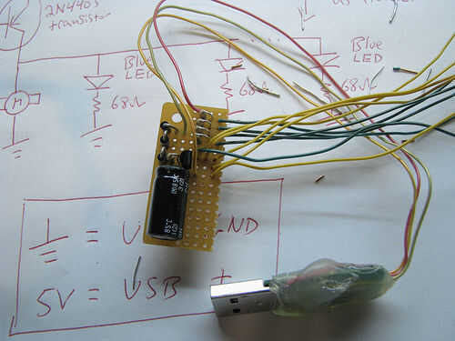 El circuito de control es muy sencillo para este dispositivo, el número de diodos que aparecen puede ser necesario ajustar. La salida de la salida de LED de la unidad no vaya a cero por lo que los diodos son para algunos de lo exceso de voltaje la gota para que el circuito no enciende hasta la salida del variador se convierte realmente. La tapa de uF 1000 está allí suavizar la impulsión intermitente LED salida. Sin la tapa el circuito todavía funcionaría pero los LEDs y el motor ser pulsados. He probado el concepto de circuito en un protoboard primero para asegurarse de que trabajó antes de hacer una versión de la placa permanente de perf. La ubicación de componentes fueron hecha para ser muy compacto ya que hay espacio limitado en el caso (si quieres que todo a permanecer oculto).