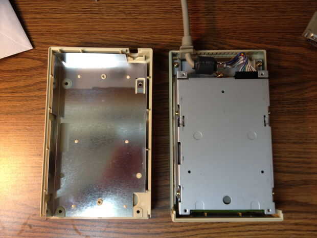 Dé vuelta la unidad sobre sus pies y luego levante la parte superior de la caja. El ojal de caucho que se ajusta alrededor del cable SCSI simplemente encaja en una ranura en ambas mitades de la caja así lo sostenga en su lugar mientras usted Levante la parte superior de la caja. Retire los dos tornillos de cabeza phillips (doradas en el disco) en la parte superior de la imagen que se muestra (uno a la izquierda, una a la derecha). Sólo hay 2 tornillos que sujetan todo dentro de la unidad. El frontal de la unidad se mete debajo de unas lengüetas sobre el caso.