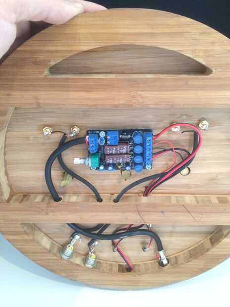 Esto significaba que sólo necesitaba un pequeño amplificador interno para conducir la señal a los altavoces. Puedes ver la pequeña placa de PCB amplificador en la segunda foto de arriba. El volumen está configurado a un valor de gama media dejando la opción para el control de volumen de entrada desde el exterior; por ejemplo, enganchó la reverberación hasta el envío de efectos de un mezclador y utiliza los mandos de nivel para que se envíe para controlar cuánto se vibran los altavoces.