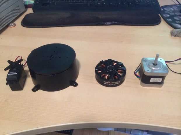 Lo siguiente era utilizar un motor sin escobillas como el centro de uno en la imagen. Estos motores de cardán eje hueco serían perfectos para el anillo de resbalón y serían un ajuste fácil para el montaje del eje. Lamentablemente, en las 200 vueltas por la pierna, cog horriblemente cuando se intenta conducir a una velocidad considerable. Motores sin cepillo de la propulsión por otro lado quieran girar 10 x la velocidad que necesitamos para el trémolo. Huelga dos.