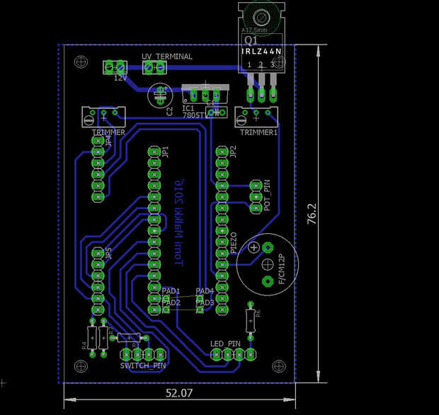 Esquema es un lío pero básicamente hice simplemente expansión shield para arduino nano donde enchufar los cables, resistencias pullup/abajo, zumbador, terminales, etc. de FET... Ese regulador de 5v externo no es necesario si utiliza construcción de arduino en regulador.