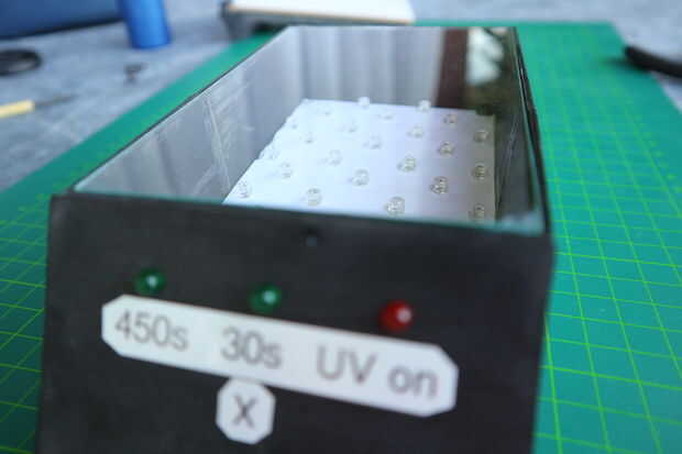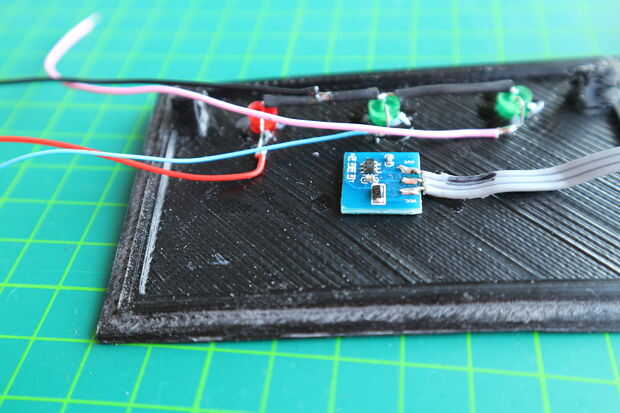 Mientras que los secos se puso al frente. Para esto pegué los LEDs y el sensor de contacto con superglue en. A continuación, había soldado los cables de los LEDs y el sensor.